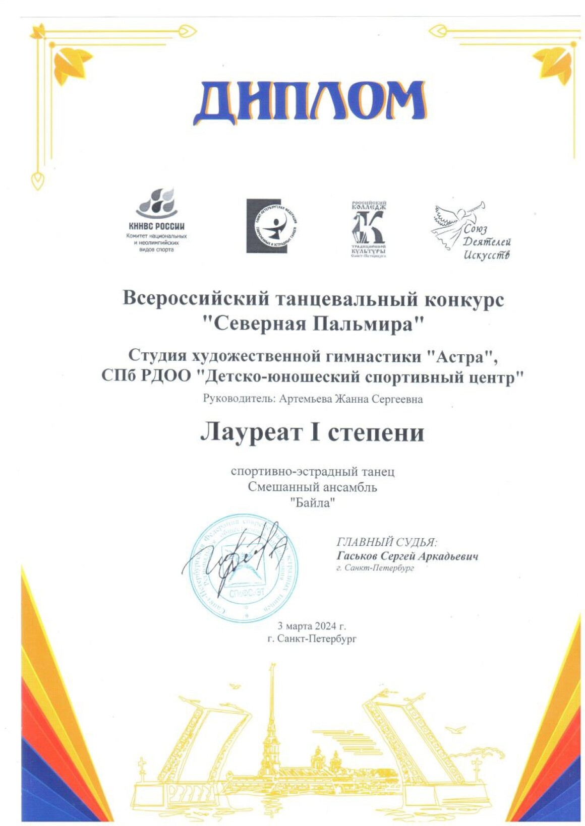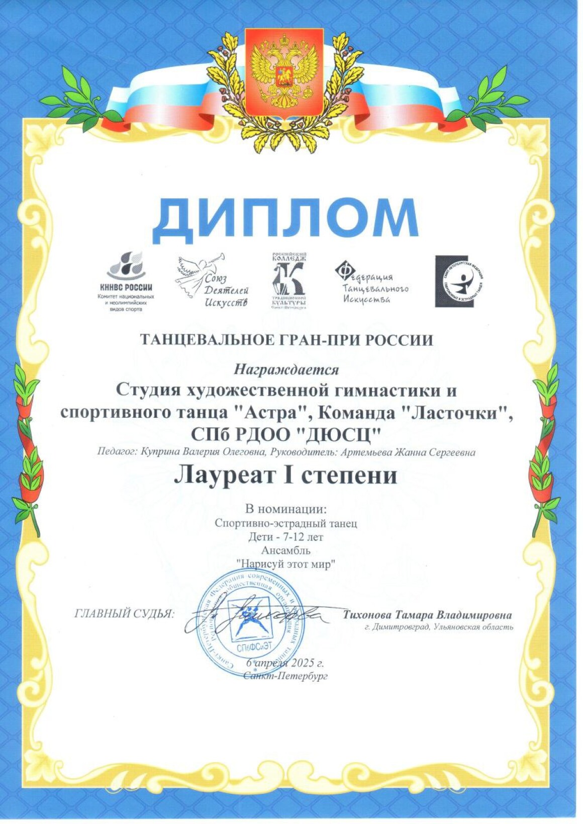 Дипломант 1й Всероссийской Гимнастрады 2020 г, г. Москва;