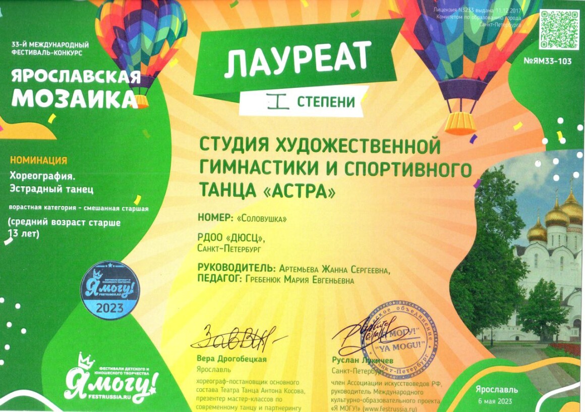 Лауреат Всероссийских и Международных конкурсов танцевального творчества 2021–2025 гг. (Всероссийский конкурс «Гран-При России Baby Dance» 2021, г. Санкт-Петербург; Всероссийский конкурс «Блистательный Санкт-Петербург», 2023 г, г. Санкт-Петербург; Международный фестиваль-конкурс «Ярославская мозайка» 2023 г, г. Ярославль; Всероссийский конкурс «Северная Пальмира» 2024 г, г. Санкт-Петербург; Международный фестиваль-конкурс «Союз добра» 2024 г, г. Минск; Всероссийский конкурс «Творцы и хранители» 2025 г, г. Санкт-Петербург).